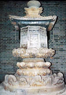 大殿西侧门外,有一座用红砖花墙围成的六角形护塔亭,亭内矗立着草堂寺最珍贵的文物——“姚秦三藏法师鸠摩罗什舍利塔”。鸠摩罗什(343-413年)是位有传奇色彩的高僧,其父亲印度人,母亲龟兹人,他7岁随母出家,人称“神童”。游历许多国家,通晓多种语言文字。因通晓经藏、律藏、论藏,被尊为“三藏法师”。他所译的佛教典籍,为中国佛教作出了巨大之贡献。