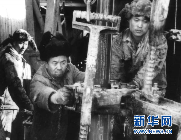 1959年,被誉为“铁人”的大庆油田一二0五钻井队队长王进喜(中)和工人们在井架上。