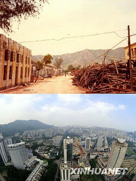上图:开发前的深圳蛇口老街(1979年5月23日摄)。 下图:高楼林立的深圳蛇口工业区(2008年10月10日摄)。