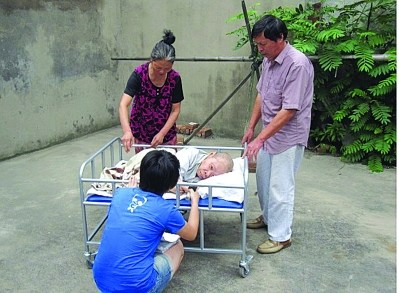 哥哥躺在推床上,弟弟一家把他推到院子里呼吸新鲜空气