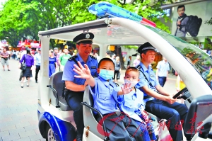 坐在电动巡逻车上,两位小朋友全神贯注地巡视步行街上的往来人员,寻找“坏蛋”。面对路人的好奇目光,两位小朋友目不斜视非常尽职。途中,警察叔叔为小涵展示身份证识别器的使用方法,坐在后排的小彬马上从坐位上挪到前排,挤在小涵身旁听警察讲解。如果不是戴着口罩,根本看不出这两个生龙活虎的小朋友刚刚从重症病房走出来。