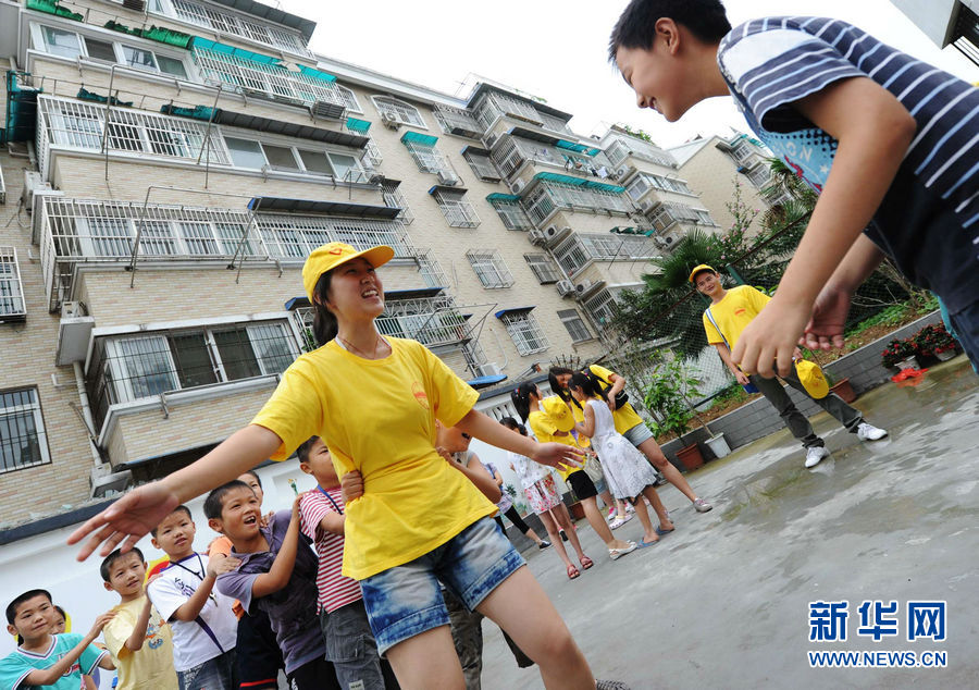 7月14日,合肥工业大学的大学生志愿者到合肥瑶海区的快乐家园儿童俱乐部,与流动儿童一起做游戏等。