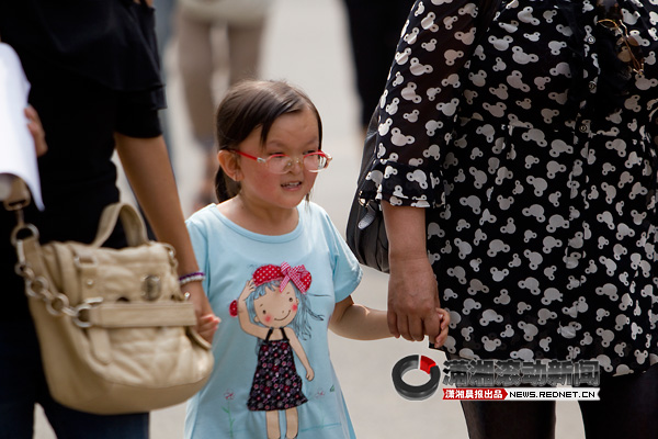 3日上午,新生报到处,褚杨一手牵着爸爸褚百云,一手牵着爱心妈妈杨芳丽,一脸的好奇。