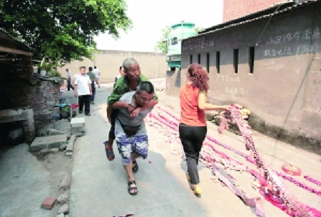 歪歪坐在滑轮车上早早守候在路口,还是穿着那件军绿色的上衣。剃了头发,刮了胡子。虽然手脚变形后肢体行动不便,但他仍然热情地与每一位来赴宴的邻居打招呼。邻居来了,附近厂里的工人们也来了。