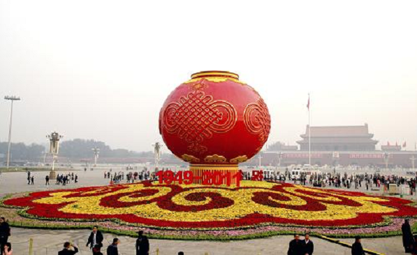 今年天安门广场中心花坛方案运用了灯笼、中国结、祥云等传统元素,主景为嵌有“中国结”的灯笼,花坛直径50米,顶高15米,南北两侧分别布置“1949-2011”“祝福祖国”等字样。中国红和金色等代表中国喜庆颜色的运用,使花坛的中国传统文化韵味十足。