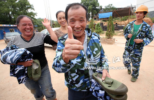 农民工兄弟穿上交大新生捐赠的军训服十分高兴