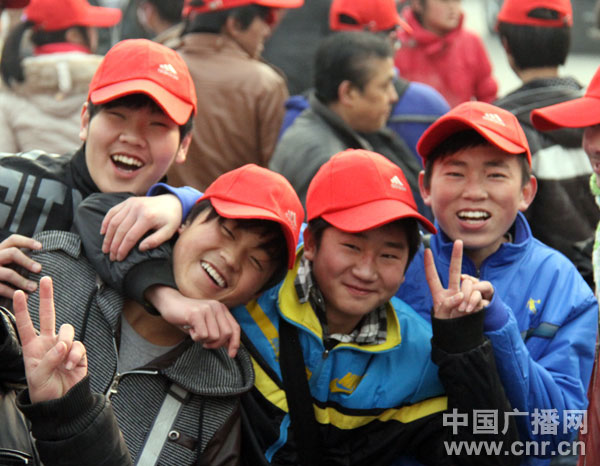中午十一点,兰州市火车站广场上,三百多个年轻人戴着红帽子,排队准备进站,鼓鼓囊囊的行李就堆放在地上。尽管气温很低,许多人红扑扑的脸上依旧充满了笑容。
