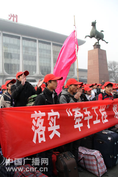 12月20日中午,甘肃省三百多名农村贫困家庭的青年乘坐火车从兰州出发,前往江苏8个企业就业,而这也是甘肃和江苏两地实行“牵手工程”后的首批赴江苏就业者。