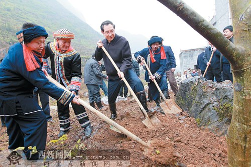 广西自治区主席马飚与都安瑶族自治县大兴乡九香瑶族新村群众一起种植核桃树