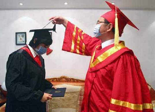 授予学士学位证书的程序简单而隆重。由于端端抵抗力低,因此在授予学位证书的时候,副校长和她都得戴上口罩。刘建达笑说:“这是我第一次戴口罩为毕业生拨穗,感觉很特别。在病重的情况下,端端通过自己的努力拿到了学士学位,并且身体渐渐康复,我们感到非常欣慰。我们特意来到端端家中举行这个仪式,是对她的鼓励,也是对学生个体的人文关怀。”