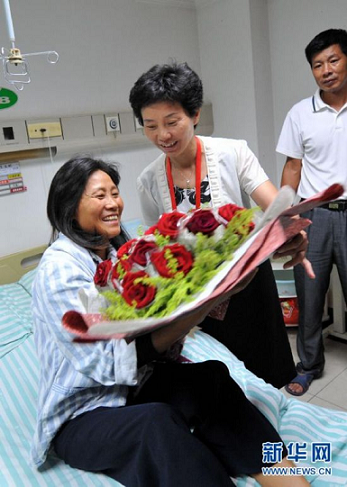 一名红十字志愿者在得知李景珍已可以出院的消息后,主动帮她联系了爱心车队。仪征红十字会人员和部分爱心人士也来到南京接李景珍回家,并表达继续关心的善意。(新华社)