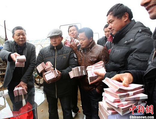 昨天(1月6日),天寒地冻,一场令人热血沸腾的农民年终颁奖大会在江西安义县鼎湖镇一农家大院举行:院子中央的一张小玻璃桌格外令人关注,桌上搁着厚厚一堆现金,共有140多万元!被叫到名字的农民挨个上前,喜滋滋从种粮大户凌继河手中领取年终奖。其中,仅“种粮状元”刘高美一人就获得了16.3万元奖金。