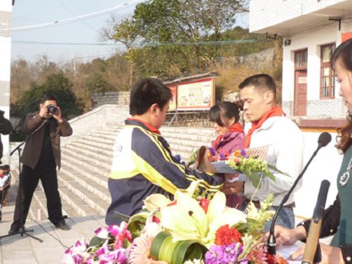 少先队员向何玥父母鲜花(资料图片)