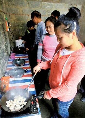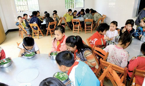 2011年4月14日上午11时许,下课铃声响起,寄宿生拿着各自的饭碗,来到崭新的食堂前等候开饭。厨房里,冰箱、蒸饭机一应俱全。两名老师正在忙碌着,数学老师韦善一边翻动着锅里的菜,一边说:“每天有两名老师轮流为孩子们做饭。”