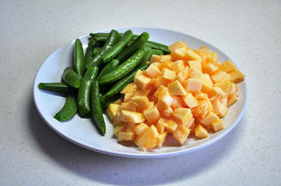 3,南瓜去皮,切成小丁;甜豆撕去老筋,摘洗干净。