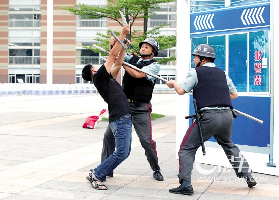 在突发事件演练中,安保队员奋力制止硬闯校门的带刀人员。 新快报记者 黎湛均/摄