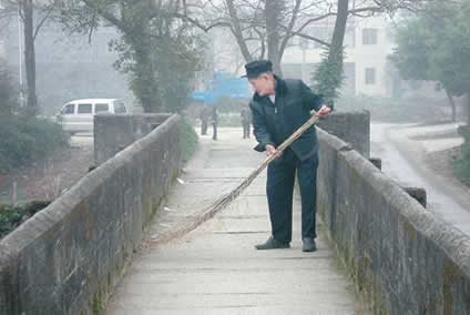 被大家称道的这位老人叫龚大淳。 “最初是为了不让人说我们村子卫生差。”龚大淳老人说,他扫的这条路是从华江进入东村的唯一道路,1994年,进村道路还没有水泥硬化时,外地人到东村来玩,往往刚走上进村的石桥时就眉头紧皱。“他们看到桥上面的垃圾和树叶,就讲‘这个村子的人好邋遢哦,看看这路就晓得了。’我当时觉得这个进村道路干净不干净,关系到我们整个村子的名誉”。于是,从那年开始,每天早上,龚大淳老人就出门开始扫地了。