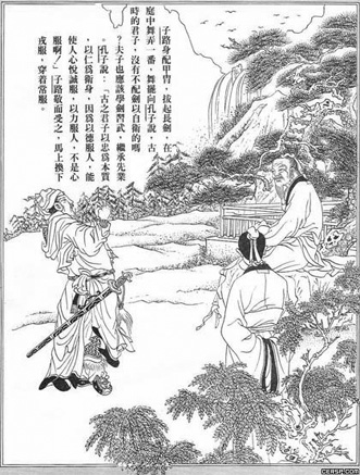 有一天,子路身着戎装,全副武装地来拜见孔子,见到夫子后,拔起剑就舞了起来,问:「夫子,古时的君子,也是用剑来自卫的吧?」孔子答道:「古时的君子,以忠义为人生追求的目标,用仁爱作为自己的护卫,虽然不出窄小的屋子,却知道千里之外的大事。有不善的人,就用忠信来感化他;有暴乱侵扰的人,则用仁义来使他们安定。这样,又何须持剑使用武力呢?」子路听了非常的敬佩,感慨道:「啊!我今天才听到这样的话,我愿从今以后,至诚恭敬地向您求教啊!」